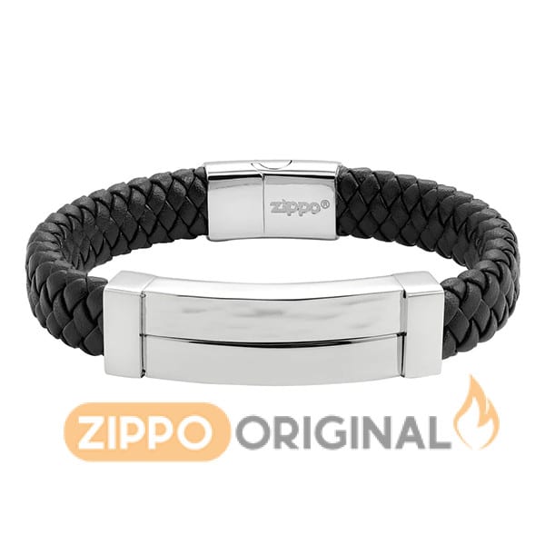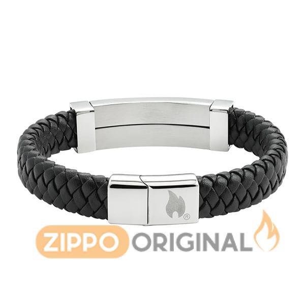 دستبند چرمی بافته شده، با دو سیم نازک و پیچیده شده در یک نوار چرمی صاف. انتهای دستبند به سادگی در یکدیگر فرو رفتهاند. قفل مسطح مغناطیسی، نگه داشتن ایمن را تضمین میکند. قسمت داخلی قفل با لوگوی زیپو تزئین شده است. در قسمت بیرونی، شعله زیپو قرار دارد.