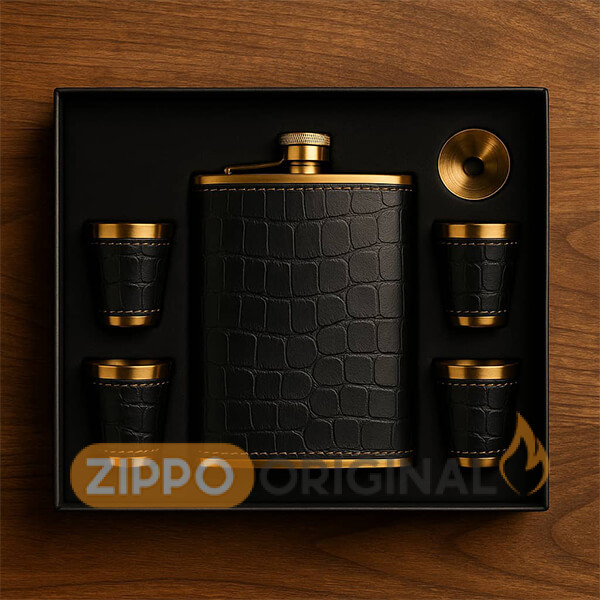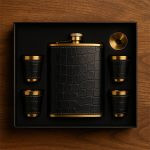 این ست شامل فلاسک با روکش چرمی بدنه طلایی مقاوم، چند عدد شات هماهنگ و قیف فلزی مخصوص است که همگی با دقت در یک جعبهی شکیل و محکم قرار گرفتهاند. روکش چرمی علاوه بر زیبایی، حس خوشدست بودن و دوام بالا را فراهم میکند و جزئیات فلزی استیل، جلوهای حرفهای و ماندگار به محصول میبخشند.