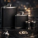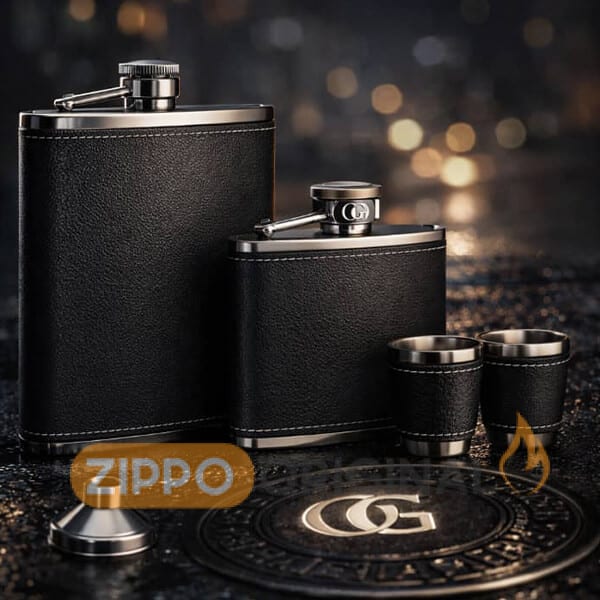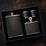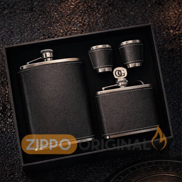 در این مجموعه، دو عدد فلاسک فلزی با روکش چرمی مشکی قرار گرفته که علاوه بر ظاهر شیک، بسیار خوشدست و مقاوم هستند. روکش چرمی با دوخت ظریف، حس لوکس بودن را چند برابر کرده و مانع لغزش فلاسک در دست میشود. در کنار فلاسکها، دو عدد لیوان شات فلزی برای سرو نوشیدنی و یک قیف فلزی جهت پر کردن آسان فلاسکها قرار داده شده است تا تجربهای کامل و بدون دردسر داشته باشید.