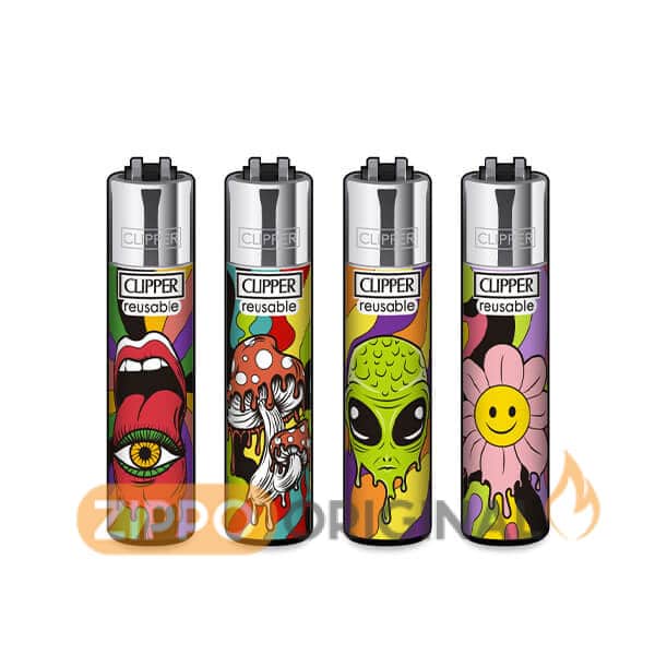 فندک کلیپر طرح Hallucinations (توهمات) با چهار طراحی متفاوت و جسورانه، بازیگوشی ذهن، هنر سایکدلیک و نمادهای سورئال را کنار هم آورده. از چشم بیدار و زبان سرکش گرفته تا قارچهای خیالی، موجودات فضایی و گلهایی که انگار از رؤیا بیرون آمدهاند. هر فندک یک حالوهوا دارد، و کنار هم یک روایت کامل میسازند.